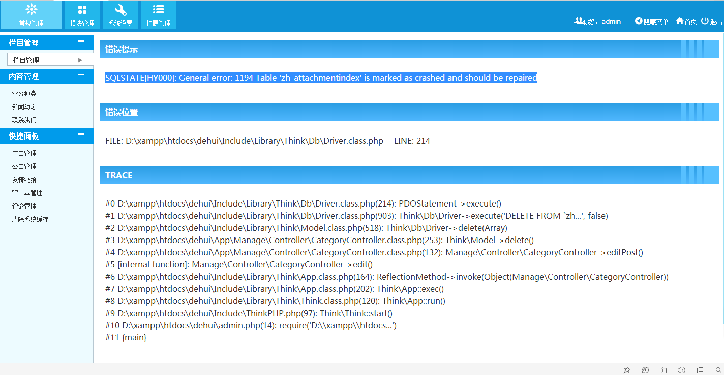 SQLSTATE[HY000]: General error: 1194 Table 'zh_attachmentindex' is marked as crashed and should be repaired這個是什么錯誤???????修改文章欄目的時候提交就出現(xiàn)了這個錯誤