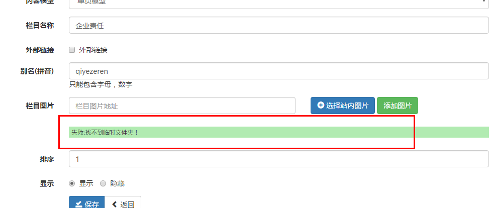 還有,我想在一級欄目加一張欄目圖片,卻上傳不了。報錯“失敗:找不到臨時文件夾!”,這是什么情況?